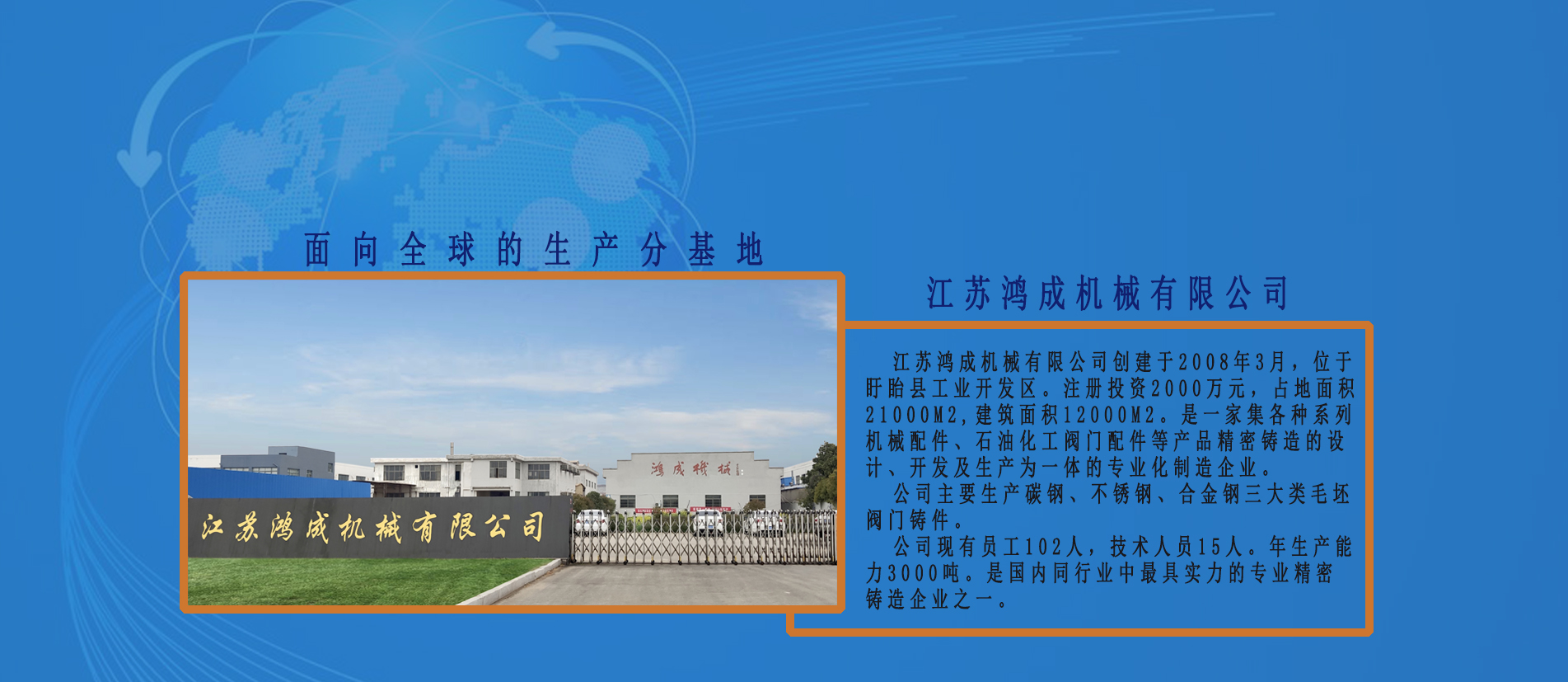 成立于江蘇程投資2008,占地面積25000 m2專業(yè)生產超過DN200口徑,體重超過150公斤。
